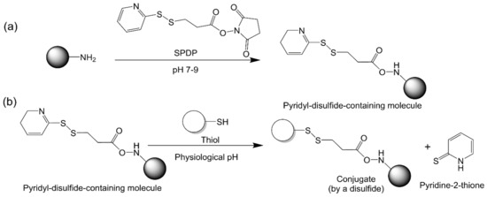 Thiol–disulfide exchange. (a) Functionalizing compounds with a pyridydithiol group. (b) Thiol–disulfide exchange between a thiol-containing compound and a pyridydithiol-containing compound.
