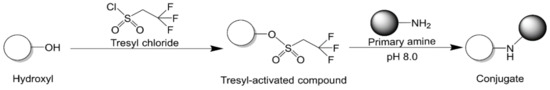 The protein can be also conjugate to the carriers or other moieties through hydroxyl group. In such strategy, hydroxyl group is activated by tresyl chloride to further react with primary amine groups (Figure 10) [101,102,103,104]. Tresyl-functionalized entities are highly reactive with primary amines through alkylation, yielding no spacer between the two compounds. This method has been used to modify adenovirus viral capsid proteins [105,106] and conjugate protein antigens to lipid molecules for liposomal formulations [101,102]. Tresyl chloride activation can be performed in mild conditions [107]. However, as the reaction targets amine groups of biomolecules for conjugation, site-specificity can be a problem in some cases.
