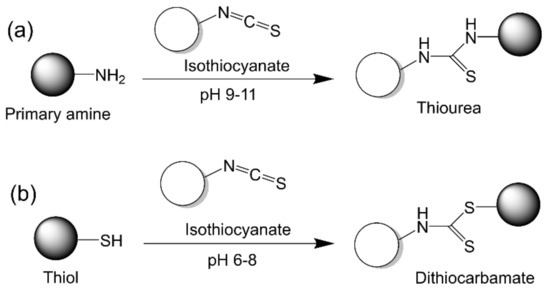 Isothiocyanate chemistry. (a) Isothiocyanate reacting with primary amine. (b) Isothiocyanate reacting with thiol.
