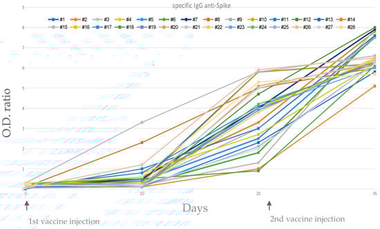 We evaluated immune responses in 28 immunocompetent subjects who received two doses of BNT162b2 mRNA Pfizer vaccination. Six out of 28 sera collected at day 10 showed specific anti-RBD IgG OD ratio values considered positive (>0.8), whereas serum from each of 28 individuals were positive at day 20 (1 dose). Moreover, all 28 individuals increased the OD ratios at day 36 (2 doses) (Figure 1).