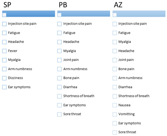 Reported side effects of vaccines arranged according to their frequency. AZ: AstraZeneca Vaxezevira; PB: Pfizer BioNTech vaccine, SP: SinoPharm vaccine.