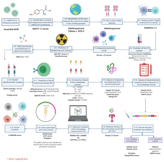 Vaccine development pipeline: the design stages of the multi-epitope vaccine proposal are shown. Each stage is important for meeting the objective of identifying peptides capable of generating an immune response, taking into account the most frequent alleles in Latin America. The important servers and cutoff values used in the process are specified.