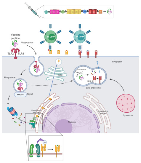 Antigenic presentation from the proposed vaccine: The assembly of peptides with vaccine potential are recognised by cell membrane receptors capable of recognising patterns associated with pathogens, such as TLR2 and 4 from dendritic cells. After recognition, the construct is phagocytized by the cell together with TLR, allowing its interaction with MyD88 and the maturation of the phagosome. From the phagosome, the peptide can take two routes: the first route is towards the proteasome, where the peptide is degraded, internalised in the ER and assembled with HLA-I molecules; the second route involves the internalization of the peptide in the late endosome, where it is assembled with HLA-II molecules and subsequently presented on the cell membrane of the LT [103,104,105].