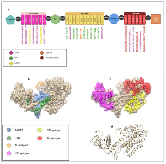 To create a multi-epitope vaccine, potential HTL, CTL, and BL epitopes were linked using GPGPG, AAG and KK linkers, respectively. For a better immunogenic response, four adjuvants were added using the EAAAK linker, -defensin 3, Tetanus toxin peptide and a Diphtheria toxin peptide linked by a cathepsin cleavage site (TpD), and a universal T helper epitope (PADRE). A peptide domain (CTGKSC) targeted by M cells was also added to the C terminal, promoting transcytosis between enterocytes and antigenic uptake at the intestinal level [74].
