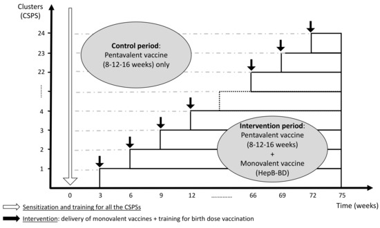 As discussed in the introduction, the evidence supporting the addition of HepB-BD to the conventional vaccination series is limited. Nevertheless, there has been an established WHO recommendation to administer HepB-BD to all newborns. The stepped wedge design has the advantage of making all CSPSs benefit from the intervention by the end of the trial, which is politically and ethically more acceptable than the parallel cluster randomized trials, in which half of clusters do not receive the intervention for the duration of the study [25]. Moreover, the sequential rollout has fewer logistical constraints, avoiding an overcommitment of human and financial resources in comparison to the instantaneous implementation.