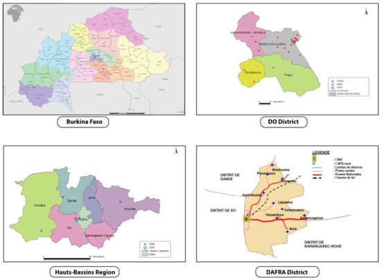 Study area (rural zones of Dô and Dafra districts in Hauts-Bassins Region). Adapted from Plan d’action sanitaire de Dô et Dafra [28,29].