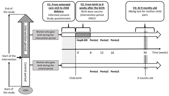 All infants, irrespective of the study period, will receive three doses of pentavalent vaccine at 8-12-16 weeks as scheduled in the national immunization program. Screening of pregnant women for HBV infection is recommended in the country but not yet systematically conducted. In the study zone, none of the CSPSs and none of the district hospitals provide antenatal screening for HBV or the treatment of chronic HBV infection using antiviral therapy. Hepatitis B immune globulin (HBIG) is not available in the study area.