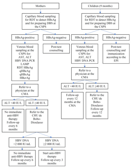 Mother–child pairs will be screened for HBsAg when the children return to the CSPS to receive the yellow fever vaccine and the first doses of the measles and rubella vaccines that are scheduled at the age of 9 months in Burkina Faso. Capillary blood will be obtained from mother–child pairs by finger-prick for a rapid diagnostic test (RDT) to detect HBsAg (DETERMINE™ HBsAg 2, Abbott, Abbott Park, IL, USA) [30,31] and DBS. The result of the HBsAg test will be immediately given to the participants on-site. Following the post-test counselling, 8 and 4 mL of blood will be drawn by venipuncture from the HBsAg-positive mother and HBsAg-positive child, respectively. The DBS from all participants and venous samples from those positive for HBsAg will be transferred to the Centre Muraz. Sera from infected mothers will be tested for alanine aminotransferase (ALT), aspartate aminotransferase (AST), HBV DNA PCR (RealTime HBV Viral Load Assay, Abbott), qHBsAg and qHBeAg (ARCHITECT, Abbott), HBeAg RDT (SD Bioline, Abbott), HBcrAg (Lumipulse, Fujirebio Europe, Gent, Belgium), and HBV-LAMP (Eiken Chemicals, Tokyo, Japan). Sera from infected children will be tested for ALT, AST, and HBV DNA. Vaccination history ascertained through the child vaccination card and HBsAg test result will be entered in the V3 CRF (Document S4). Participants identified to carry HBsAg will be given a next appointment to receive results of the laboratory tests (Figure 4), while V3 will be the final study visit for those testing negative for HBsAg. Hepatitis B vaccinations will not be systematically offered to HBsAg-negative women, because the vast majority of adults in Burkina Faso have been in contact with HBV during childhood, resulting in the prevalence of total hepatitis B core antibodies (anti-HBc) exceeding 70–80% in adults [32,33].