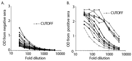 A sensitive and specific ELISA was used to measure antibody levels. (A). 28 serum samples collected prior to 2016 were used to determine the cutoff value for antibody levels. (B). The first 14 serum samples from participants with confirmed COVID-19 diagnosis served as positive controls for the ELISA and were determined to fall above the cutoff line.