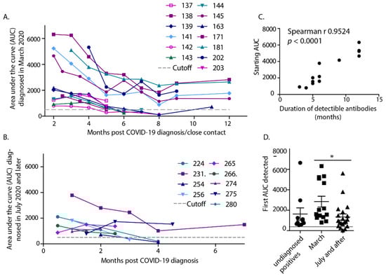 Antibody titers were measured up to 12 months post-infection. (A) AUCs were determined monthly post-infection over a longer term for people diagnosed in March and (B) over 5 months for participants diagnosed in July or later. (C) There was a strong correlation between the starting antibody level (AUC) and the duration of antibodies, from a total of 13 XY pairs, with a Spearman r of 0.9524, p-value < 0.0001. (D) Initial AUCs of 3 groups, those diagnosed in March, July or after, and those without a diagnosis, but detectible antibody titers. There was a statistical difference between antibody levels from people diagnosed in March compared to those diagnosed in July or after. * p < 0.05 as determined by Kruskal-Wallis test with Dunns post-test.
