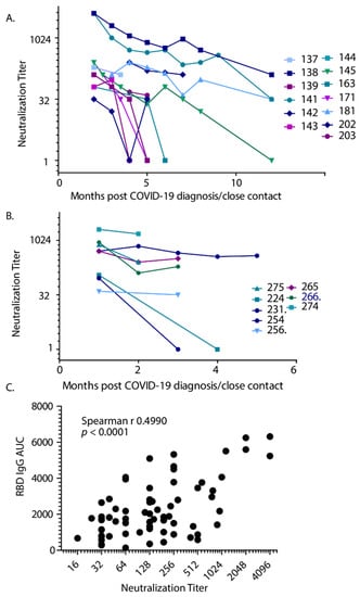 We measured the capacity for collected sera to neutralize SARS-CoV-2 for both those infected in March (Figure 3A) and those infected in July and after (Figure 3B). These assays were performed in BSL-3 containment with serum samples that were not inactivated with 1% Triton-X100 and the neutralization titers are reported as the inverse of the serum dilution that provided 50% protection of the monolayer. There was a correlation between anti-RBD IgG AUC and the capacity to neutralize SARS-CoV-2 (Figure 3C). Thus, the results suggest that anti-RBD IgG AUC is a valid predictor of the capacity of serum to neutralize SARS-CoV-2 in vitro, confirming the findings in earlier studies [15,26]. However, serum from one subject was below the cutoff for anti-RBD-IgG but retained the capacity to neutralize the virus (Table 1). Further investigation of this phenomenon is warranted.