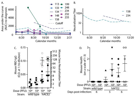We greatly appreciate the enthusiastic participation of all subjects that agreed to partake in these studies, especially those who gladly returned month after month. Our gratitude to Agnieszka Rynda-Apple and Douglas Kominsky for collaboration with the development of the COVID-19 mouse model. Thanks to David King for helpful discussions and enthusiasm, Seth Pincus for helpful discussions, collaborations and manuscript review and Mark Quinn for manuscript review. The following reagent was produced under HHSN272201400008C and obtained through BEI Resources, NIAID, NIH: Spike Glycoprotein Receptor Binding Domain (RBD) from SARS-Related Coronavirus 2, Wuhan-Hu-1 with C-Terminal Histidine Tag, Recombinant from HEK293F Cells, NR-52366. The following reagent was deposited by the Centers for Disease Control and Prevention and obtained through BEI Resources, NIAID, NIH: SARS-Related Coronavirus 2, Isolate USA-WA1/2020, NR-52281.