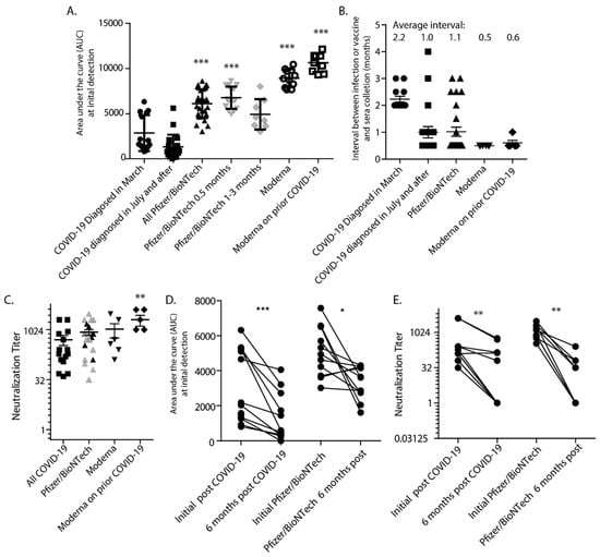 Protection from infection has been assessed for participants in vaccine clinical trials [5,6] and the comparison of antibody titers and neutralization capacity induced by the vaccines compared to those generated in response to natural infection is of interest. Thus, we have assessed sera from those fully vaccinated (at least two weeks after the second dose) with either the Pfizer/BioNTech (23 people) or Moderna (11 people) vaccines and compared these antibody levels to those generated following natural infection. AUC levels were significantly higher in sera from those that were vaccinated compared to following natural infection (Figure 5A). For the Pfizer data, we also show the means of the group collected 2 weeks after vaccination, and those collected 1–3 months after vaccination. These data show that the mean AUC 2 weeks after vaccination with Pfizer/BioNTech is lower than the Moderna mean, also assessed 2 weeks post-vaccination. However, no matter which interval post-vaccination is compared, there were no statistically significant differences between Pfizer/BioNTech and Moderna, both vaccines induce robust responses. The interval between serum collection and COVID-19 diagnosis or second dose of the vaccine was slightly different (Figure 5B). The average time after COVID-19 diagnosis was 2.2 months for those infected in March, and 1.0 month for those infected in July and after. However, the average AUC from March was higher despite this longer interval between infection and sampling. Thus, sampling closer to diagnosis was likely not the reason for the differences in AUCs between the groups. Sera was collected an average of 1.0 months after vaccination with Pfizer/BioNTech and 2 weeks after Moderna. Thus, our natural infection and vaccine-induced antibody levels are comparable and the interval after infection or vaccination is not the reason for significant differences in antibody titers.