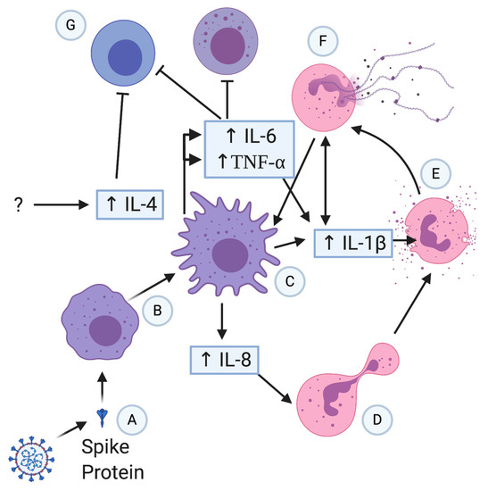 Potential severe patient hyperinflammation progression in COVID-19. Spike protein (A) activates macrophages (B) that release various proinflammatory cytokines; (C) IL-8 attracts neutrophils (D), which have the potential to degranulate (E) and form NETs (F). NETs can potentially form a positive feedback loop with macrophages and IL-1β release. Macrophages release IL-6 and TNF that inhibits and causes apoptosis in T cells and NK cells (G), causing or exacerbating lymphopenia.