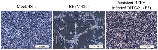 The BHK-21 Cell morphology changes in BEFV infection. Mock 48 hr: The BHK-21 cells were mock infected for 48 hr. BEFV 48 hr: The BHK-21 cells were infected with BEFV for 48 hr. Persistent BEFV infected BHK-21 cells (p3): The BEFV-infected BHK-21 cells survived and maintained their culture (passaged 3 times). The cells were imaged with 400× microscope, and the scale bar showed 200 μm.