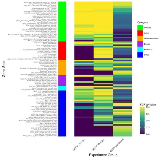 BHK-21 cells were inoculated with BEFV and total cellular mRNA were harvested at the indicated time with the QIAzol Lysis Reagent (Qiagen Co. Ltd., Crawley, WV, USA) according to the protocol of the manufacturer. Total cDNA was prepared by the SensiFAST™ cDNA Synthesis Kit (Bioline, Memphis, TN, USA) and analyzed by next generation sequencing service (Illumina, 150 pb pair end, 6G, Tools Co. Ltd. Taipei, Taiwan). All NGS samples were aligned to the BHK-21 genome (Mesocricetus_auratus. MesAur 1.0.98) by using the STAR aligner [15,16]. The gene expressions were determined as FPKM by using the Cufflinks [17] to assemble and quantify FPKM transcripts. To evaluate the biological pathways altered between BEFV-infected BHK-21 cell and mock-infected BHK-21, the Gene Set Enrichment Analysis (GSEA) (Broad Institute, Cambridge, MA, USA, java GSEA Desktop Application version 4.1.0) [18,19] tool was employed. The KEGG pathway gene subsets of GSEA Molecular Signatures Database (MSigDB) [18] C2-curated gene sets (186 gene sets), along with external senescence-related gene subsets, were applied to enrichment analysis (total 204 gene sets). The external senescence-related gene subsets were added in the analysis, as the references described in Supplementary Table S1. Gene set enrichment was considered significant at FDR < 0.25 [18].