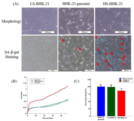 The different SA-β-gal staining property and the virus production of subclonal BHK-21 cells. (A) Cell morphology and the SA-β-gal staining results for LS-BHK-21, parental and the HS-BHK-21 cells. The cells were imaged with 400× microscope, and the scale bar shows 200 μm. (B) The adhesion properties and cell events of the parental and subclonal cells are showed as cell index curve which is measured by RTCA iCELLigence™. (C) The particular BEFV titer (48 h.p.i.) cultured by the parental and subclonal cells were compared to the BHK-21-parental group and showed as percentage. Fold change means with different letters are significantly different (Tukey’s HSD, p < 0.05).