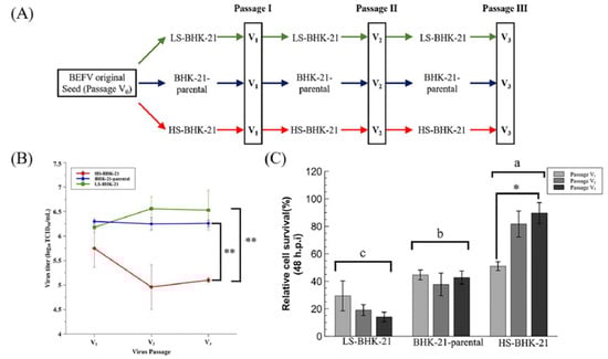 To mimic virus passage during industrial scale virus production, we further investigated how virus titer may change with serial passage of BEFV in the BHK-21 subclones (Figure 4A). Results showed that, for three passages, BEFV titers remained low in HS-BHK-21 when compared to LS-BHK-21 and parental BHK-21 (Figure 4B). This indicates that culturing BEFV in HS-BHK-21 cells may further inhibit virus replication during serial passage. The survival rate of the subclones after each round of virus infection was also tracked (Figure 4C). The three cell populations showed significantly different cell viability after BEFV infection (HS-BHK-21 > BHK-21-parental > LS-BHK-21). HS-BHK-21 showed remarkable resistance to BEFV induced CPE in passage 3. The time-lapse CPE image records in three different senescence states also confirmed the results (https://youtu.be/bVz9VxudRLo, accessed on 3 June 2021). These results indicated that culturing BEFV in HS-BHK-21 cells may further inhibit the virus replication in the following virus passages. A senescence-like cellular function change that may enhance anti-viral response in BHK-21 cells was discovered.