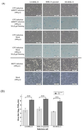 The following are available online at https://www.mdpi.com/article/10.3390/vaccines9060601/s1, Table S1: External senescence-related gene subsets added in the analysis title, Figure S1: Cell morphology and SA-β-gal stained images of 36 BHK-21 subclones, Figure S2: The SA-β-gal staining positive cell ratio in parental and subclonal BHK-21 cells, Figure S3: The BEFV can infect all three BHK-21 clonal cells.