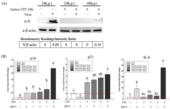 The CPT induced senescence-like response markers, P16, P21 and IL-6, in BHK-21-parental cells with or without BEFV infection. (A) The BHK-21-parental cells were pretreated by CPT for 24 h and followed the BEFV infection for 24 and 48 hr, as indicated. The virus was detected by Western blotting with the mouse anti-viral protein N antiserum. (B) The cell p16, p21 and IL-6 gene expression in (A) were analyzed by the qRT-PCR respectively and showed as gene expression fold change compared to mock (red line indicate 1-fold). Means with different letters are significantly different (Tukey’s HSD, p < 0.05).