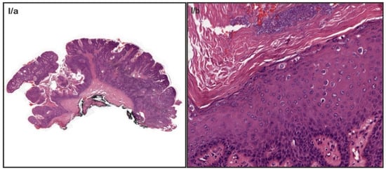 Histological characteristics of external genital warts. Note, the cauliflower-like architecture at the low power (I/a), Acanthosis, and parakeratosis with the presence of koilocytes in mid power image (I/b).
