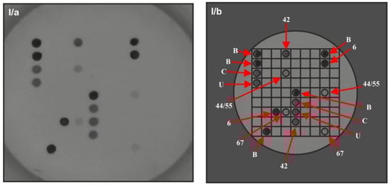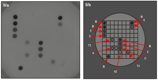 HPV genotype detection with Direct Flow CHIP test. I: Low-risk 6, 42, 44/55 and 67 HPV genotype multi-infection in patient with external anogenital warts. (I/a, I/b): snapshots before and after processing with hybriSoft software. Controls and the HPV genotypes were tested in duplicates. II: Low-risk 6 and high-risk 73 HPV genotype coinfection in patient with external anogenital warts. (II/a, II/b): snapshots before and after processing with hybriSoft software. Spot B: Hybridization control (5 signals to orientate the CHIP). Spot C: Internal DNA control (genomic human DNA probe). Spot U: HPV universal probe.