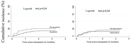 CMV reactivation is common after allogeneic HSCT []. In our cohort, the cumulative incidence of CMV DNAemia at 100 days post-transplant was 19.9% (95% CI: 14.5–27.1), while it ranged from 21.8% to 24% within four months in similar pediatric HSCT studies [,,]. Importantly, in our study, the incidence of CMV DNAemia remained unchanged with the use of acyclovir or famciclovir. This is similar to findings reported by Selby et al. [], Lundgren et al. [], Ljungman et al. [], and Prentice et al. [] who suggested that acyclovir was ineffective for the prevention of CMV infection. However, some studies have shown that a high dose of acyclovir might have a protective effect against CMV among HSCT recipients. Prentice et al. [] undertook a randomized study to compare the long-term (one-year) efficacy of acyclovir in three groups: group A (intravenous acyclovir 500 mg/m2 given three times/day from day 3 to day 30, then oral acyclovir 800 mg four times/day from day 31 to 210); group B (intravenous acyclovir 500 mg/m2, three times/day from day 3 to day 30, then placebo from day 31 to day 210); and group C (oral acyclovir 400 mg, four times/day from day 3 to day 30, then placebo from day 31 to day 210). Their survival analysis showed a 360-day post-transplant cumulative incidence of CMV viremia of 54% in group A, 50% in group B and 60% in group C. The difference between group B and group C was statistically significant (p = 0.03). Meyers et al. [] studied the efficacy of acyclovir in a cohort of CMV seropositive HSCT recipients and showed that acyclovir significantly reduced the probability of CMV infection (0.70% vs. 0.87% p = 0.0001) and CMV disease (22% vs. 38% p = 0.008) after 100 days of follow-up among the group of patients who received intravenous acyclovir 500 mg/m2 every 8 h from day 5 to day 30 post-transplant, in comparison to the group which did not receive acyclovir. Another randomized study by Gluckman et al. [] on the prophylaxis of herpesviruses with oral acyclovir 200 mg every 6 h from day 8 to day 35 post-transplant reported that oral acyclovir was effective against CMV compared to placebo on day 35 (0% vs. 7% p ˂ 0.007). It appears from these studies that the use of high-dose acyclovir may have a certain effect on CMV. However, despite a possible protective effect noted in some studies, the number of incident cases of CMV remains high in the exposed groups. Indeed, at the dose commonly prescribed as prophylaxis for HSV or VZV seropositive recipients, acyclovir does not appear to influence the incidence of CMV. Our study also showed no potential impact of famciclovir on CMV. The effect of famciclovir on CMV has been examined in only one study among adults [], which showed that CMV reactivation was higher in seropositive patients who received oral acyclovir or famciclovir (p = 0.0001) compared to those who received oral valacyclovir and ganciclovir.