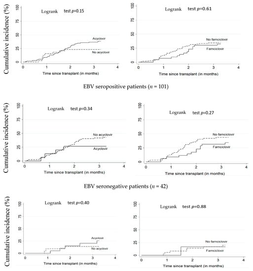 In our cohort, the 100-day post-transplant cumulative incidence of EBV DNAemia was 34.5% (95% CI: 27.6–42.6). This is similar to the cumulative incidence reported in several studies ranging from 22.6% to 32% in a follow-up period of one to two years among pediatric HSCT recipients [,,]. Our study showed no effect of acyclovir or famciclovir on the incidence of EBV. Hann et al. [] also found no reduction in the risk of EBV with the use of acyclovir in a randomized study. Similarly, Paula et al. [], Krzysztof et al. [], and Zutter et al. [] showed no effect of acyclovir on EBV incidence. To our knowledge, no study on famciclovir and EBV has been conducted among pediatric HSCT recipients. However, among children with solid organ transplants, a meta-analysis [] showed no significant effect of famciclovir on EBV (adjusted HR = 0.80 (95% CI: 0.42–1.51)).