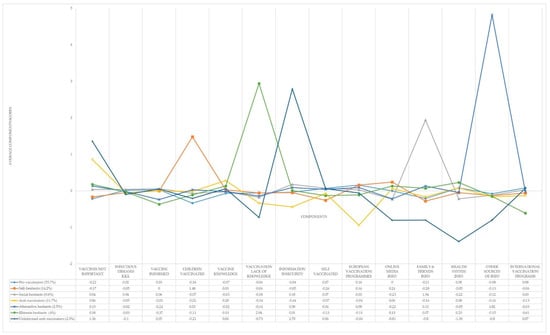 In sum, we obtained 14 components out of the 44 original variables that explained 66% of the total variance. The two most important ones, in terms of the total variance explained individually, were related to the belief that infectious diseases kill (C2, 8% of the total variance) and vaccines are important to fight them (C1, 9% of the total variance). On the other hand, if we consider all the components that were connected with the information (C4, C6, C8, C9, C10, and C13) summed up the highest proportion of the total variance explained (23%). The rest of the components could also be gathered into three different groups: the first connected with the vaccination status (C5 and C11, 9% of the total variance); the second related to the knowledge about vaccines (C3) and vaccination (C12), which together explained 9% of the total variance; and, finally, two components (C7 and C14) linked with the international level at which the vaccination programs should be managed (7% of the total variance explained).