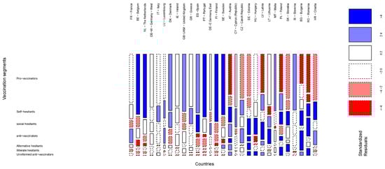 In a recent report based on a descriptive analysis of the same survey that we used in this paper, the European Commission stated that “…While in general Europeans have a reasonably high level of awareness and a generally positive attitude towards vaccination, there is considerable variation in knowledge and behavior across countries and between socio-demographic groups” [42] (p. 59). The results in the previous section of this paper depicted that cross-European segments based on attitudes towards vaccination existed. When European countries were considered in order to see if there were any significant variation between them in the segments obtained, we concluded that it was not the case. The geographical differences found by the European Commission could be rather linked to the different proportions in which the cross-European segments were represented in each of the member countries than the non-existence of these homogeneous groups. It can be graphically appreciated in Figure 2. It shows a MOSAIC chart [43] that can be interpreted, in a two-way table, as a grouped bar chart where the width of each bar corresponds to the relative frequencies of the first variable (number of interviews per country) and the height of each bar shows the relative frequencies of the second variable (European segments towards vaccination). Standardized residuals are represented in the chart by shadowing the tiles: those that exceed values 2 and 4 in absolute terms are deep-colored. When it occurs, it means that the found pattern departures from the Equiprobability model (independence between the variables). Statistically speaking, it means that, as the standardized residuals are approximately unit-normal N(0,1), the shadowed areas are those whose individual residuals are significant at 0.05 level (when the value exceeds 2) and 0.0001 level (when the value exceeds 4) [44]. For the shake of clarity, we observe in Figure 2 that Pro-Vaccinators had a statistically significant higher presence in Belgium, the Netherlands, the United Kingdom, Spain, Portugal, Finland, Sweden, Malta, and Slovenia. On the contrary, Pro-Vaccinators showed a statistically significant lower presence in Austria, Czech Republic, Estonia, Latvia, Poland, Slovenia, Bulgaria, Romania, and Croatia. On the other side of the attitudes’ spectrum, Anti-Vaccinators had a statistically significantly higher presence in France, Luxembourg, Austria, Czech Republic, Estonia, Latvia, Lithuania, Bulgaria, Romania, and Croatia. In contrast, Belgium, the Netherlands, Denmark, Spain, Portugal, Finland, Sweden, Hungary, and Poland had a statistically significantly lower presence of Anti-Vaccinators. The rest of the segments and countries could be distinctly exhibited in Figure 2. The differences observed by the European Commission between European countries in their descriptive analysis are due to the different share that the seven cross- European segments had in each of the territories. Nevertheless, the profile of any of the individuals that belong to a segment remains homogeneous to the rest of the individuals that also pertain to the same segment, independently of the European country under study.