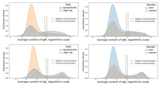 According to the analysis, the bimodal distribution of IgM and IgG content with two peaks on both sides of the boundaries of the reference interval among men and women and persons from the symptomatic and high-risk groups (Figure 1) was present.