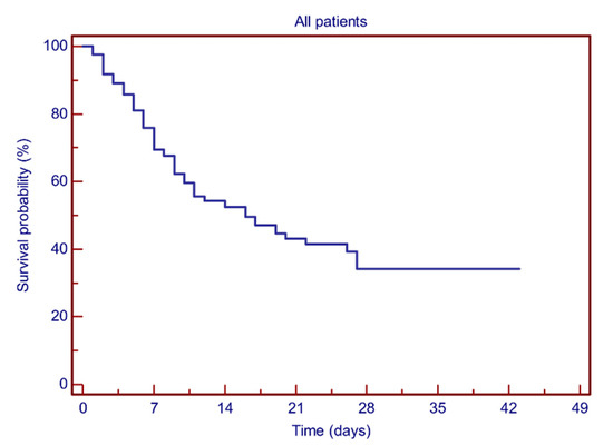 At univariate analyses, age with a cut-off point set at 70 years showed prognostic significance for survival, with an estimated 28-day survival rate of 67.4% and 21.4% for patients aged less or greater than 70 years, respectively (log-rank test: p < 0.0001) (Figure 2A).