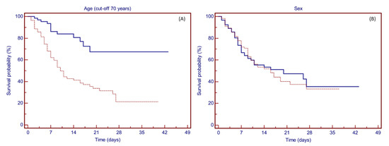 Kaplan–Meier plots showing the probability of survival based on patients’ characteristics. (A) Patients aged less than 70 years (solid line) or older than or equal to 70 years (dashed line). Age showed prognostic significance for survival at a cut-off point set at 70 years (p < 0.0001), with an estimated 28-day survival rate of 67.4% and 21.4%, respectively. (B) Survival was not affected by gender (female, solid line; male, dashed line) (p = 0.086).