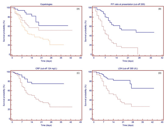 Kaplan–Meier plots showing the probability of survival based on clinical variables. (A) Patients with no comorbidity (solid line), 1 comorbidity (dashed line), and 2 or more comorbidities (dotted line). The number of comorbidities showed prognostic significance for survival (p = 0.0008), with an estimated 28-day survival rate of 61.8%, 51.7%, and 35.3%, respectively. (B) P/F ratio at presentation more than 200 (solid line) or less than or equal to 200 (dashed line). P/F ratio at presentation showed prognostic significance for survival at a cut-off point set at 200 (p < 0.0001), with an estimated 21-day survival rate of 52.4% and 14.7%, respectively. (C) CRP less than 124 (solid line) or more than or equal to 124 (dashed line). CRP values showed prognostic significance for survival at a cut-off point set at 124 mg/L (p = 0.0001), with an estimated 28-day survival rate of 74.9% and 25.4%, respectively. (D) LDH less than 395 (solid line) or more than or equal to 395 (dashed line). LDH values showed prognostic significance for survival at a cut-off point set at 395 U/L (p = 0.0001), with an estimated 28-day survival rate of 65.3% and 26.4%, respectively.