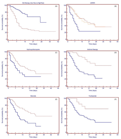 Finally, univariate analysis was tested for survival for the different treatments scheduled (Figure 4A–F). Patients requiring only low-flow oxygen therapy experienced improved survival compared to patients deserving of high-flow therapy, with an estimated 28-day survival rate of 50.0% and 23.3%, respectively (p < 0.0001). The use of any anticoagulant treatment resulted in an improvement in survival (estimated 28-day survival rate: 37.5% vs. 23.8%; p = 0.0001), while no difference was recorded between intermediate-dose or therapeutic-dose anticoagulation (36.9% and 37.1%, respectively). Hydroxychloroquine treatment was administered to 160 patients, resulting in an estimated 28-day survival rate of 35.7% vs. 27.3% of those who did not receive such therapy (p = 0.0029). Fifty-two patients received early antiviral therapy with lopinavir/ritonavir, which resulted in an estimated 28-day survival rate of 60.1% vs. 22.4% (p < 0.0001); 90 patients were treated with steroids, and 21 patients received tocilizumab. Both anti-inflammatory treatments showed prognostic significance for survival, with an estimated 28-day survival rate between treated and nontreated patients of 47.9% vs. 18.2% (p < 0.0001) and 69.4% vs. 29.6% (p = 0.0059), respectively.