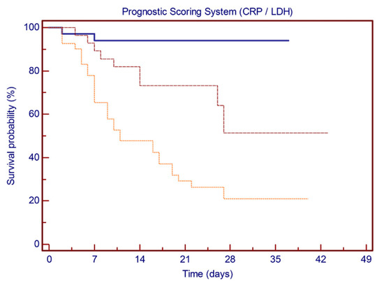 Based on ROC curve analysis, inflammation markers CRP and LDH were incorporated into a prognostic score system, attributing 1 point for each value above the identified cut-off (nominally, 124 mg/L for CRP and 395 U/L for LDH). Having none, one, or both of the positive markers determined a reduction in the estimated 28-day survival rate from 94.0% to 51.3% and 21.0%, respectively (log-rank test: p < 0.0001) (Figure 5).
