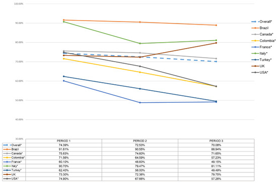 Overall, almost 27% of our sample reported vaccine hesitancy (Supplementary Figure S1). We observed significant increases in hesitancy levels across our entire sample over time (period one: 25.6%; period two: 27.5%; period three: 29.9%, p < 0.0001 for trend, see Figure 1). When looking at individual countries, French residents reported the highest rate of vaccine hesitancy (39.9%, 51.2%, and 50.9% across period one, two, and three, respectively) and Brazilian residents reported the lowest (8.4%, 9.5%, and 11.1% in period one, two, and three, respectively). Italy reported low proportions when the country was hardest hit during the initial period of the pandemic (9.3%), but hesitancy then increased to around 19% in period 3 (p < 0.0001 for trend). Significant trends in increased vaccine hesitancy were also observed in Canada, Colombia, France, Turkey and the USA (data not shown). Conversely, there was a non-significant trend towards a decrease in hesitancy from 26.7% in period 1 and 27.6% in period 2, to 20.3% in period 3 among UK residents (p = 0.35 for trend).