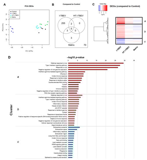 In Analysis 1, among the four treatment groups, 333 genes were considered differentially expressed based on the specified threshold level (fold change ≥2 and false discovery rate ≤5% for the average expression across the different groups; Figure 1); 264 genes (79.3%) were found to be upregulated upon I-TBEV treatment; and 69 (20.7%) were downregulated. Principal component analysis (PCA) of differentially expressed genes (Figure 1A) showed a distinct profile for I-TBEV samples, while samples in the matrix and HT I-TBEV groups clustered closer to the non-stimulated (control) group. Upon further selection of DEGs with a strong change in expression compared to the control group (minimal fold change of 2), 255 genes were found to be uniquely represented in the I-TBEV group; in the matrix and control groups, instead, only very few genes showed more than 2-fold changes in expression (Figure 1B). A heatmap representation of the differences in expression of all 333 DEGs demonstrates that I-TBEV triggered stronger up- or downregulation of DEGs (compared to the non-stimulated cells) than treatments with HT I-TBEV or matrix (Figure 1C for the average profile per treatment group, Appendix A Figure A1 for sample-specific responses). Interestingly, although HT I-TBEV induced a quantitatively weak response compared to treatment with I-TBEV, the profiles of up- and down-regulated genes were qualitatively similar for the two formulations. This was not the case for the matrix control.