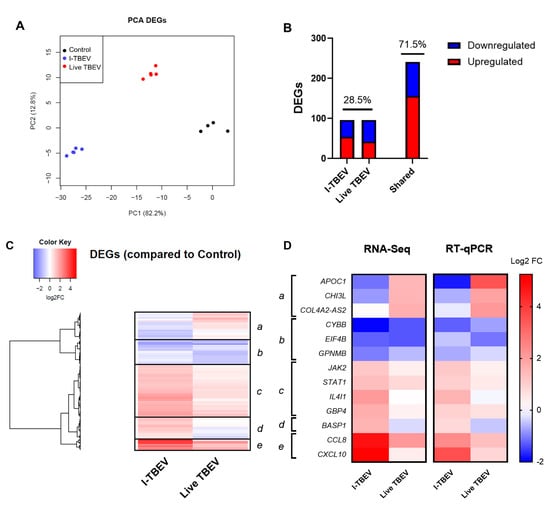 Transcriptional analysis of PBMCs stimulated with I-TBEV and live TBEV (Analysis 2). PBMCs from a healthy donor were stimulated for 24 h with inactivated TBEV (I-TBEV) at a concentration of 0.24 µg/mL or 48 h with live TBEV at an MOI of 10. After treatment, the cells were lysed and processed for RNA sequencing. (A) Principal component analysis based on DEGs. (B) Representation of DEGs with distinct or overlapping change in expression in the I-TBEV and live TBEV treatment groups as compared to the control. (C) Heatmap showing the FC of differentially expressed genes (DEGs) in the two treatment groups, normalized to the control group (set as FC = 1) and hierarchically clustered. (D) Validation of RNA-Seq results by RT- qPCR. The fold change in PBMCs was analyzed in duplicate for each gene and treatment, and was averaged for all 3 donors. Results are shown as heatmap and compared to the RNA sequencing data.