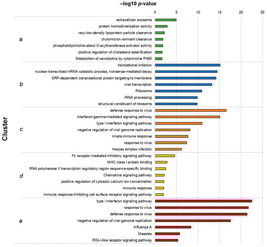 Top 7 GO terms and KEGG pathways identified in each cluster from Analysis 2. Hierarchical clusters (as presented in Figure 3C) were analyzed for functional enrichment. The clusters represent functions similarly up- (clusters (c,e)) or downregulated (b) by live TBEV and I-TBEV, downregulated in I-TBEV-treated cells and upregulated in live TBEV-treated cells (a), or vice versa (d). The bars show the –log10 of the raw p-value.