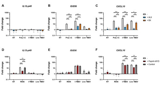 Gene expression levels in PBMCs stimulated with I-TBEV or live TBEV in the presence of inhibitors. PBMCs from 3 healthy donors were pre-incubated with RLR inhibitors (ALX, 50 µg/mL, and BX, 2 µM) for 1 h (A–C) or with MyD88 inhibitor (Pepinh-MYD, 10 µM) and its peptide control (Control) for 6 h (D–F). Afterwards, the cells were treated for 24 h with Poly I:C (0.5 μg/mL), R848 (10 μg/mL), I-TBEV (0.24 µg/mL) or live virus (MOI 10). Following stimulation, the cells were lysed and changes in gene expression were analyzed by RT-qPCR. Results are from 3 replicates. Levels of significance: ns: p > 0.05; *: p ≤ 0.05 and ***: p ≤ 0.001. Absence of labels indicates non-significant differences.