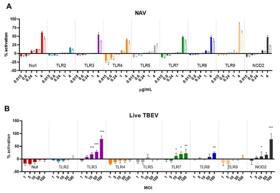 Activation of HEK Blue reporter cells by I-TBEV and live TBEV. (A) HEK Blue cells were stimulated with the indicated amounts of I-TBEV for 48 h at different concentrations. Subsequently, supernatants were added to the detection medium for assessment of NF-κB-induced production of the reporter protein. The stimulation of the cells is presented as a percentage of activation relative to the activation achieved with 2.5 μg/mL of TNF-α (set as 100%). Filled bars represent the responses to I-TBEV, empty bars responses to the matrix. (B) HEK Blue cells were stimulated with live TBEV virus for 48 h at the indicated multiplicity of infection (MOI), and activation was assessed as described above. Levels of significance: ns: p > 0.05; *: p ≤ 0.05; **: p ≤ 0.01 and ***: p ≤ 0.001 (compared to the level of activation in the Null cells stimulated with the same MOI). Results are from 3 replicates.