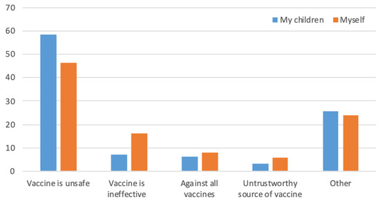 A total of 454 out of 462 (response rate 98.3%) participants responded to the question about willingness to take the vaccine. Of these, 62.6% (284/454) of participants were agreeable to COVID-19 vaccination, while 37.4% (170/454) responded with “I would not be vaccinated”. When we asked the same question regarding vaccinating their children, 200/462 individuals indicated that they had children and 92 (46%) of these said they would not vaccinate their children. Respondents who answered that they were unwilling to take the vaccine or to give it to their children were asked for their reasons. Safety and effectiveness were the main concerns regarding self-vaccination (46% and 16%, respectively), while safety was the main reason given for not vaccinating their children (58%). Respectively, 8% and 6% of participants did not believe in giving any vaccine to themselves or their children (Figure 1).