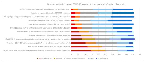 Attitudes and beliefs toward COVID-19 disease, vaccination, and immunity using a five-point Likert scale.