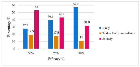Different levels of vaccine efficacy and participants’ responses on how likely they were to be vaccinated.