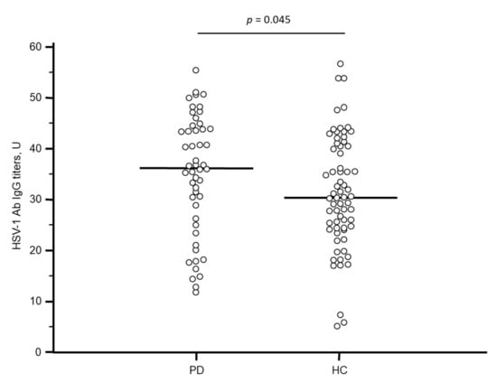 Figure 1. Distribution of serum HSV-1-specific IgG titers in Parkinson’s Disease patients and Healthy Controls. Horizontal lines represent the median. PD: Parkinson’s Disease; HC: Healthy Controls; U: units.