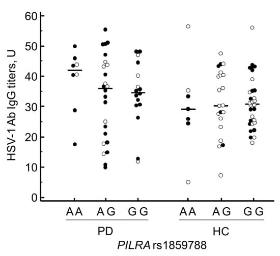 Moreover, when the study population was split in relation with gender, the rs1859788 genotypes distribution was statistically different in male PD compared to male HC (pc = 0.05; d.f.: 2; χ2 = 5.99), with, again, the minor allele A (AA + AG) being statically more frequent in male PD (64.7%) compared to male HC (37.1%) (pc = 0.036; OR: 3.056; 95% CI: 1.07–9.09) (Table 3). No relations were observed among PILRA genotype and HSV-1 (Figure 2), CMV and HHV-6 titers, HSV-1 avidity index and plasmatic α-synuclein concentration (data not shown).