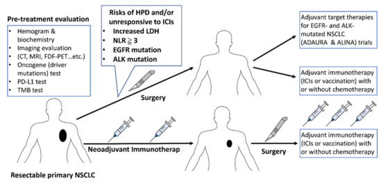 Previous clinical studies have shown that early-stage NSCLC harboring EGFR mutations had an increased risk of recurrence and metastasis [135,136]. A recent study has demonstrated that consolidation with durvalumab (anti-PD-L1 inhibitor) did not benefit the survival in stage III NSCLC patients with EGFR mutation receiving induction-concurrent chemoradiation therapy. Consolidation therapy with durvalumab also increased immune-related adverse events in post-chemoradiotherapy EGFR-mutated stage III NSCLC [137]. To date, osimertinib is the recommended post-operative adjuvant therapy for stages IB–IIIA NSCLC with EGFR mutation, based on the promising results shown in the ADAURA trial [8]. Alectinib is an effective and safe targeted therapy for advanced NSCLC patients with ALK rearrangement [138,139]. The use of alectinib as a post-surgery adjuvant therapy in stage IB–IIIA ALK-mutated NSCLC patients is currently being explored in a phase III clinical trial (ALINA trial, NCT03456076) [140]. For, EGFR- and ALK- mutated early-stage NSCLC, surgery followed by adjuvant TKIs may be considered priorly to ICIs. The other oncogene-addicted NSCLC (ex. BRAF, MET, HER2, RET, K-RAS, and NTRK mutations), neoadjuvant and adjuvant ICIs can be considered for resectable NSCLC unless the appearance of more effective and safer target therapy than ICIs.