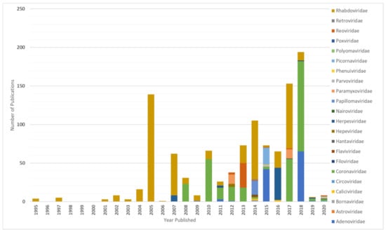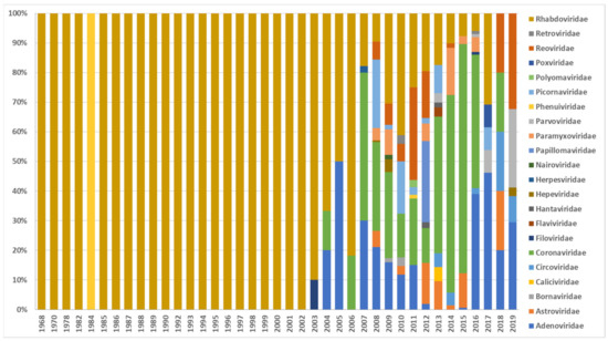 Number of published virus sequences over time, related to the respective viral family and order (DBatVir [1]).
