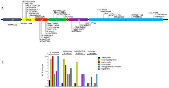 Characteristics of identified CD8+ T cell epitope candidates of Jeryl–Lynn (JL) vaccine mumps virus (MuV). Location of the JL vaccine MuV epitope candidates within the MuV proteins (A). Distribution of JL vaccine MuV candidate epitopes among the various MuV proteins. No epitope candidates of small hydrophobic (SH) protein (57 amino acids long) were identified (B). Number of total JL vaccine MuV candidate epitopes among the various MuV proteins are presented, as well as number of JL vaccine MuV candidate epitopes that show to have sequence differences in circulating MuV strains, number of JL vaccine MuV candidate epitopes that show to have sequence differences in circulating MuV strains that led to reduced predicted binding to one or more human leukocyte antigen Class I molecules, and number of JL vaccine MuV candidate epitopes with conserved amino acid sequences, i.e., epitopes that show no sequence differences in any of the circulating MuV strains. NP, nucleoprotein; V/P/I, V/phospo (P)/I proteins; M, matrix protein; F, fusion protein; SH, small hydrophobic protein; HN, hemagglutinin-neuraminidase; L, large protein.